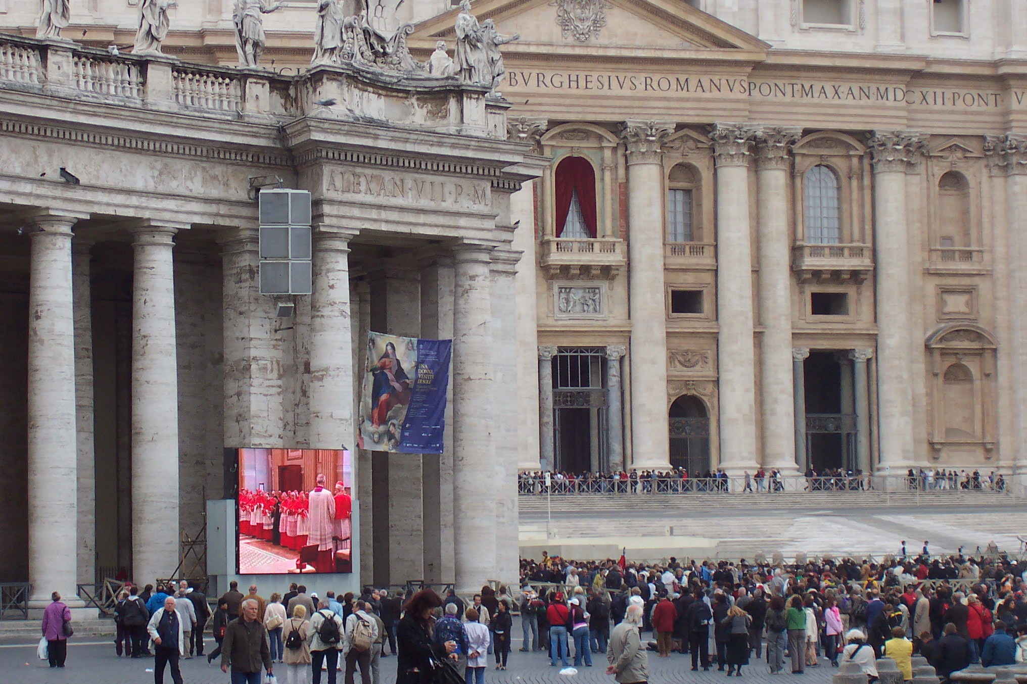 So, Laura and Amy set off to do some checking off of their own. Upon their return they found me in the same spot, sprawled on a piece of the marble stairs that ring the square, head resting on a backpack, book open. Absolutely nothing spectacular or even slightly out of the ordinary had happened here. The only notable differences in the square between this day and the two other days that I had been there were: The red velvet curtains outlining the balcony door above the public entrance to the basilica. This is where the name of the new Pope would eventually be announced and the newly anointed one would address his flock for the first time. And the second difference-2 projector big screens flanking the basilica and facing the square.
